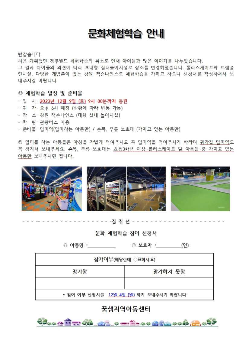 12월 변경된 문화체험학습을 안내합니다. 페이지 정보 최고관리자 23-11-29 15:08 view1,145 Comment0 관련링크 ← previous next → 목록 본문 12월 9일 토요일 문화체험학습 장소 변경안내경주월드에서 창원 잭슨나인스로 병견됨을 알려 드립니다. 페이스북 공유 트위터 공유 구글+ 공유 댓글목록 등록된 댓글이 없습니다. ← previous next → 목록