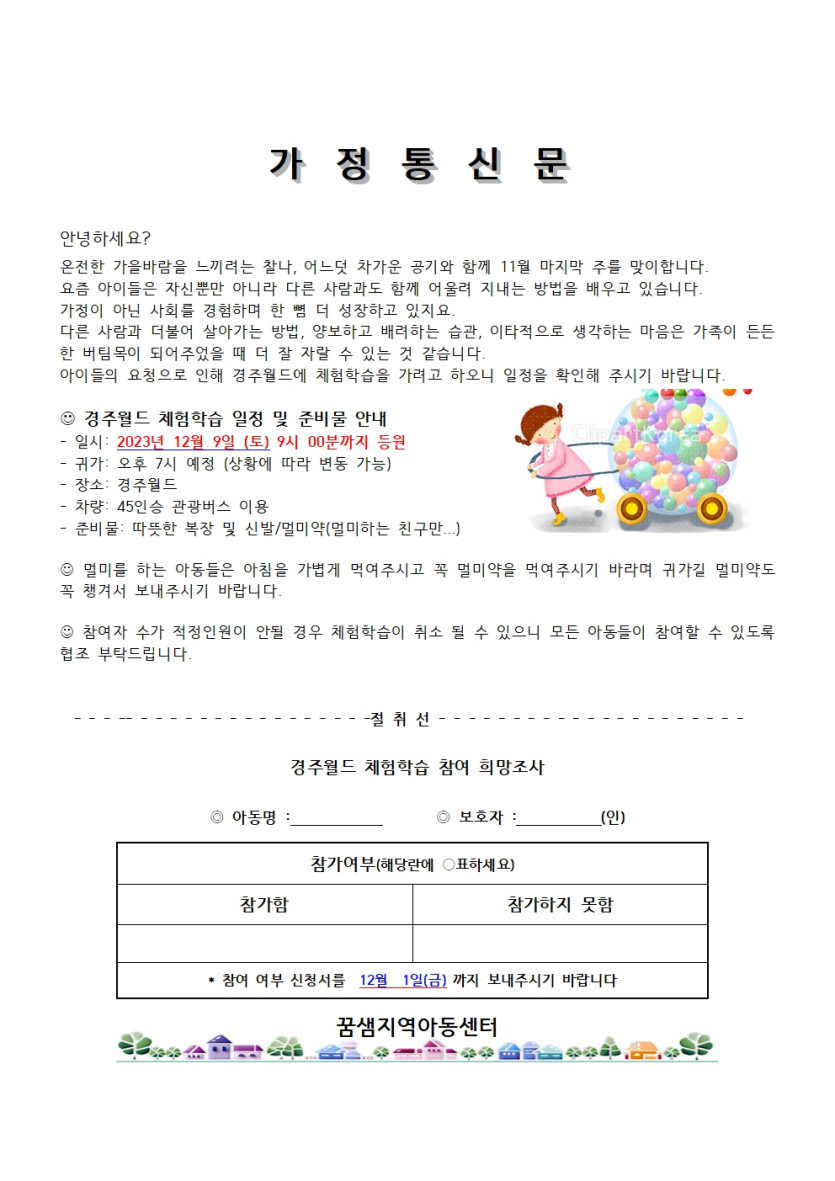 12월 9일 문화체험학습 안내 페이지 정보 최고관리자 23-11-24 18:31 view1,101 Comment0 관련링크 ← previous next → 목록 본문 아동자치회 회의에서 놀이동산을 가고 싶다는 의견에 따라 12월 9일 토요일 경주월드에 갑니다.신청서를 각 가정에 보내드렸으니 확인하시고 12월 1일까지 회신해 주시기 바랍니다. 페이스북 공유 트위터 공유 구글+ 공유 댓글목록 등록된 댓글이 없습니다. ← previous next → 목록